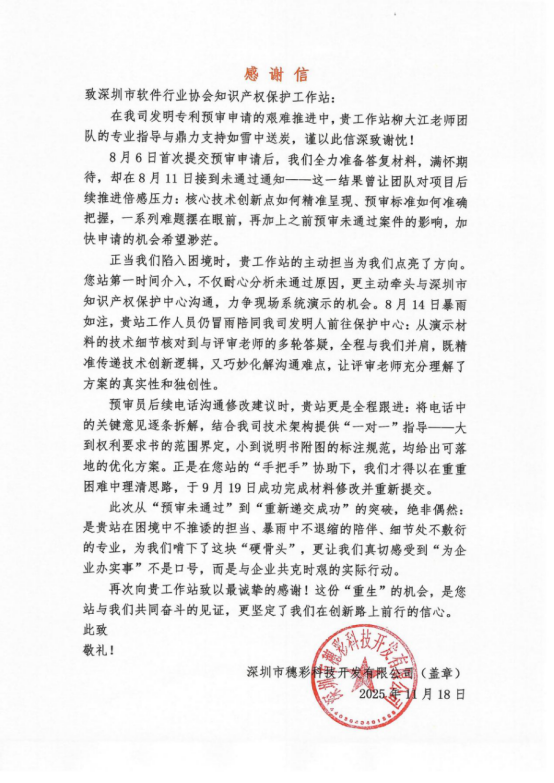 近日,深圳市穗彩科技开发有限公司(穗彩科技)向深圳市软件行业协会知识产权保护工作站(以下简称“我站”)发来感谢信,对我站在其知识产权预审申请过程中给予的全程支持表示诚挚感谢。